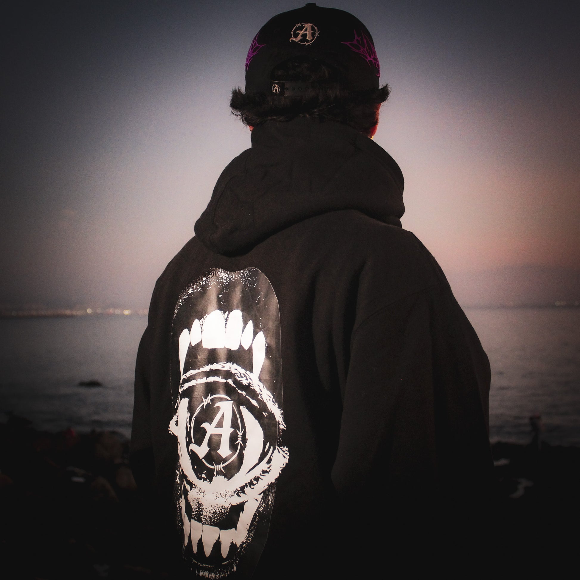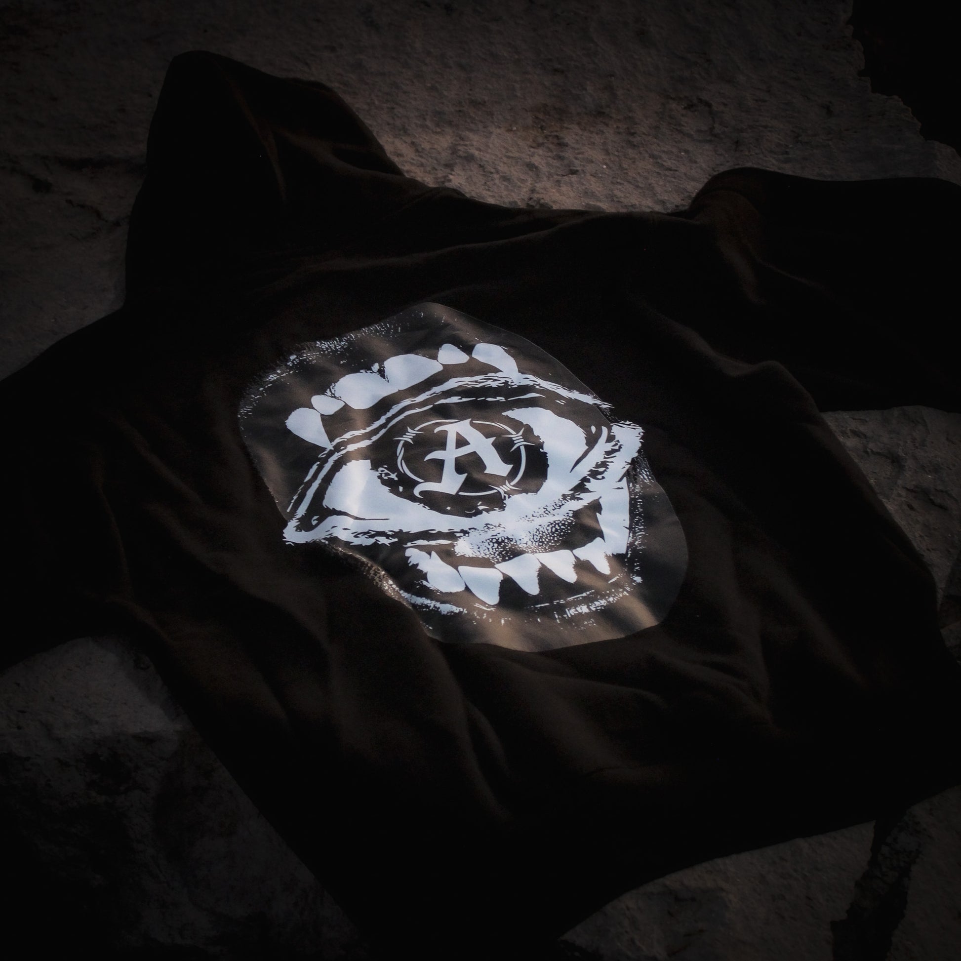 El gráfico trasero muestra una boca abierta con un ojo en su interior, simbolizando pensamientos que observan, ansiedad que no se apaga y emociones que se consumen en silencio. La “A” de la marca permanece al centro, como identidad y control dentro del caos.